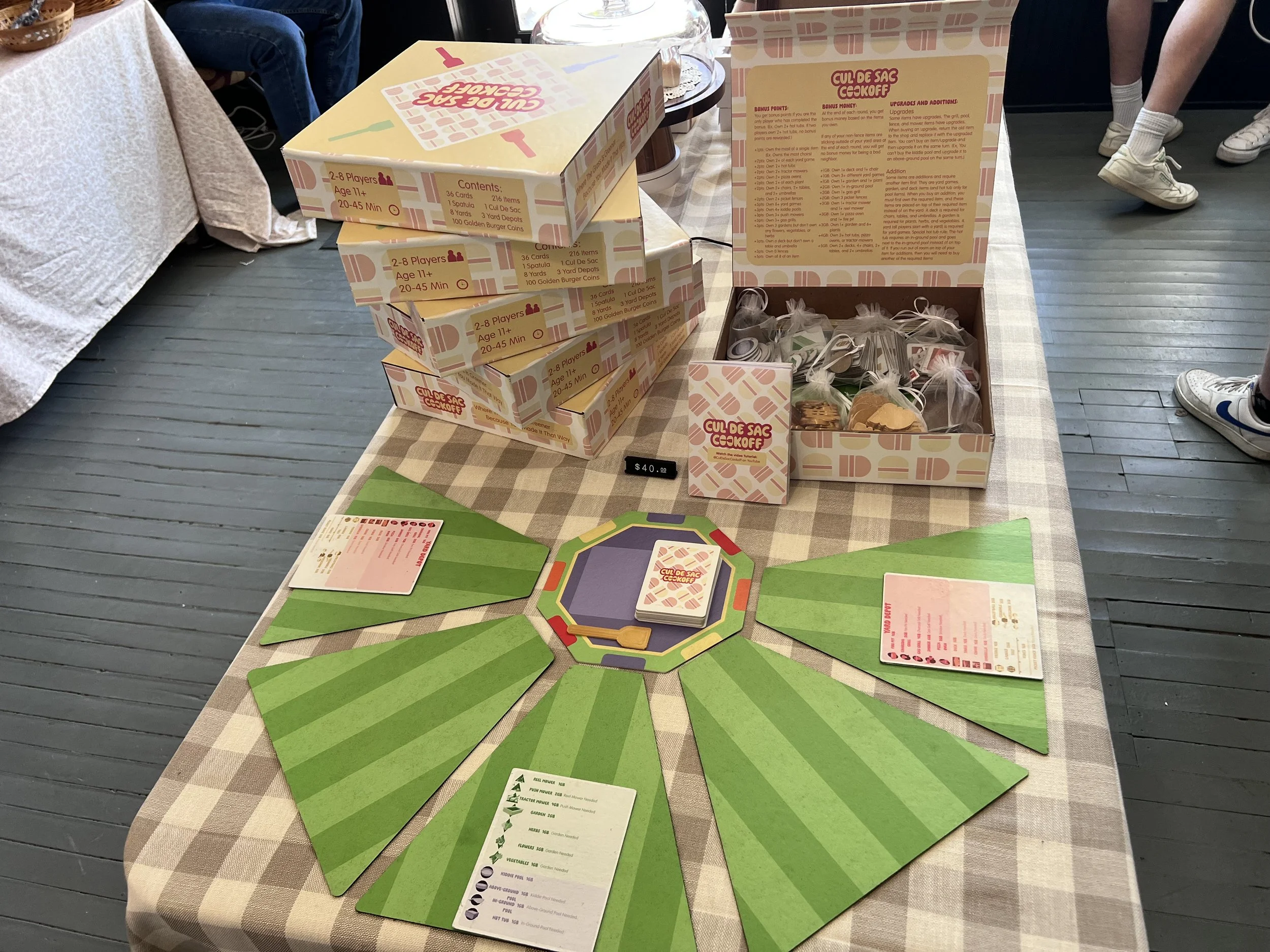 We wanted to make the instructions easier to follow, so we had all the extra rules printed on the inside of the lid. I also put information on the bottom including graphics of the set up. After that, any of the rest of the information in a booklet that came with the game. The last pieces not mentioned yet is the currency (golden 3D printed burger coins) and a chart for the prices of each item.